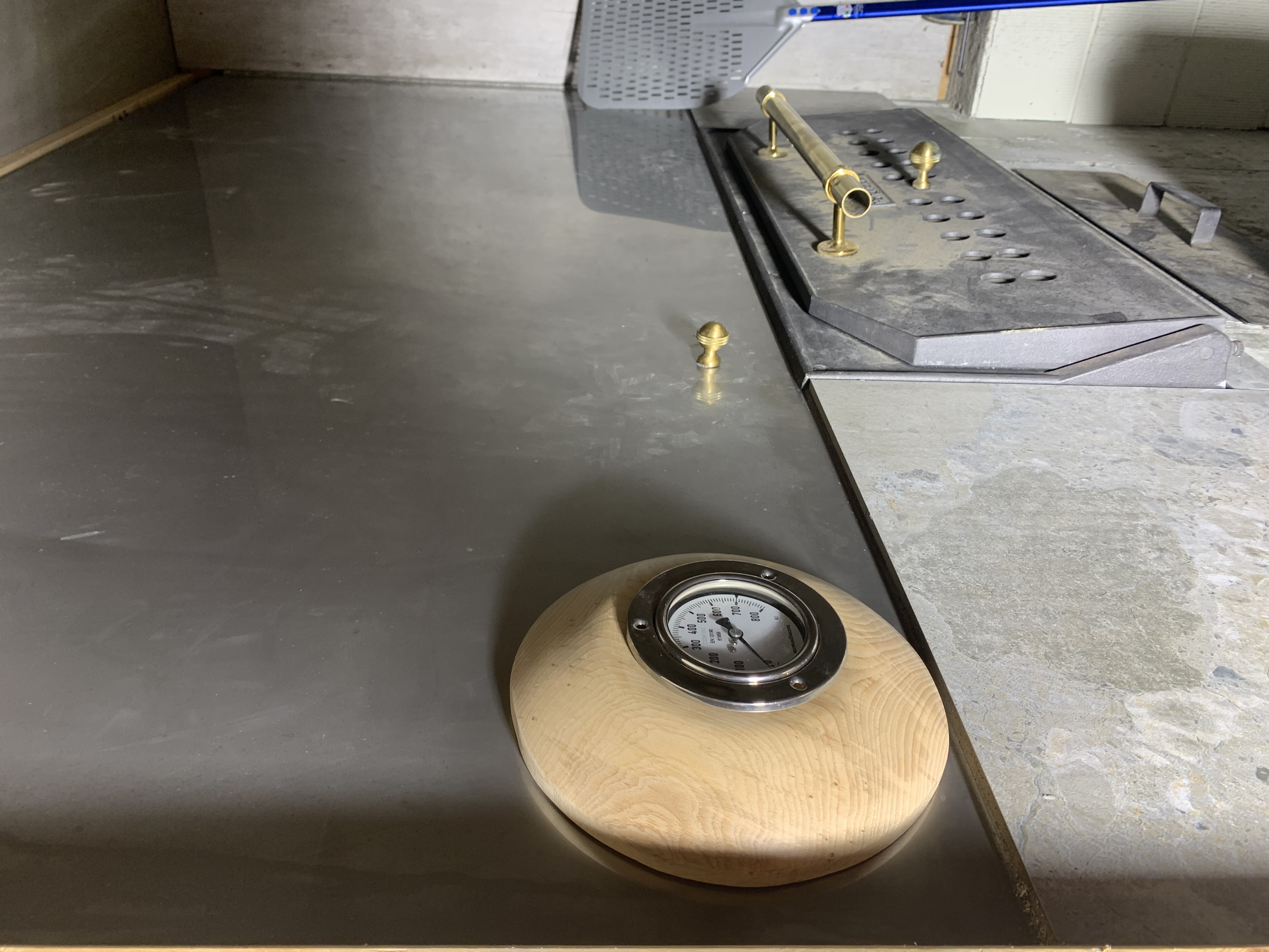 Største endring siden sist er at vi fikk opp pipa. Vi brukte Maxi pipe fra Leca for å sikre god trekk i ovnen. Vi monterte opplegget for spjeldet på taket av bakerovnen og førte det videre inn til hendelen ved siden av bakerovnsluka. Deretter isolerte vi taket med brannsikker isolasjon og la på tre betongelementer.